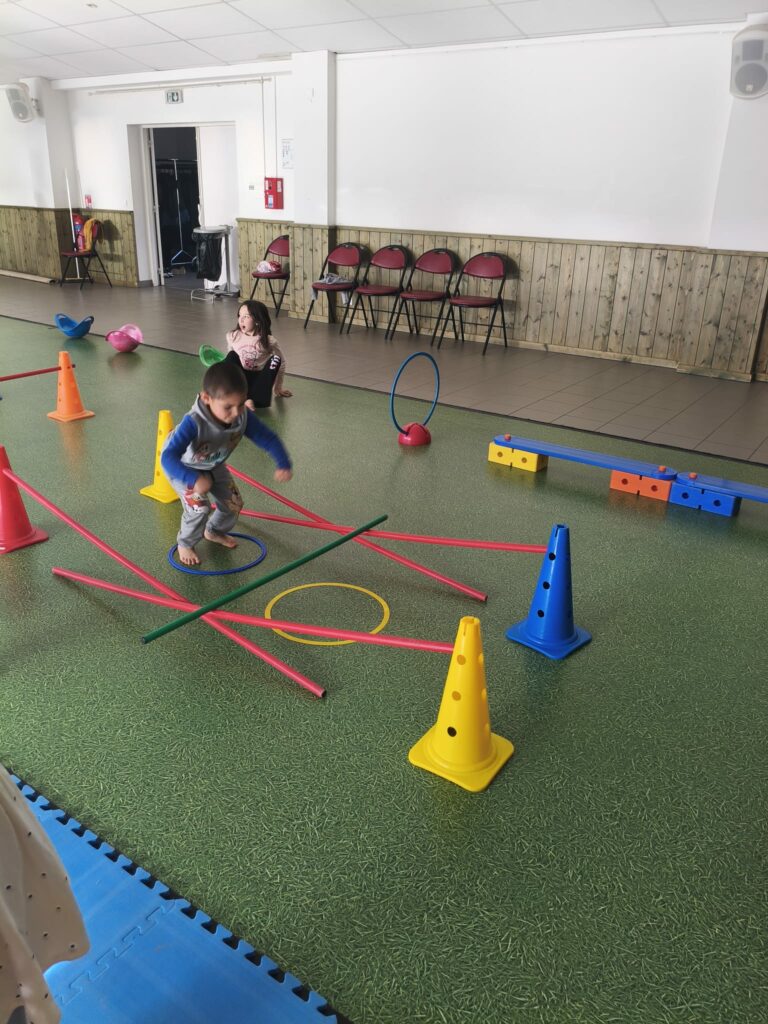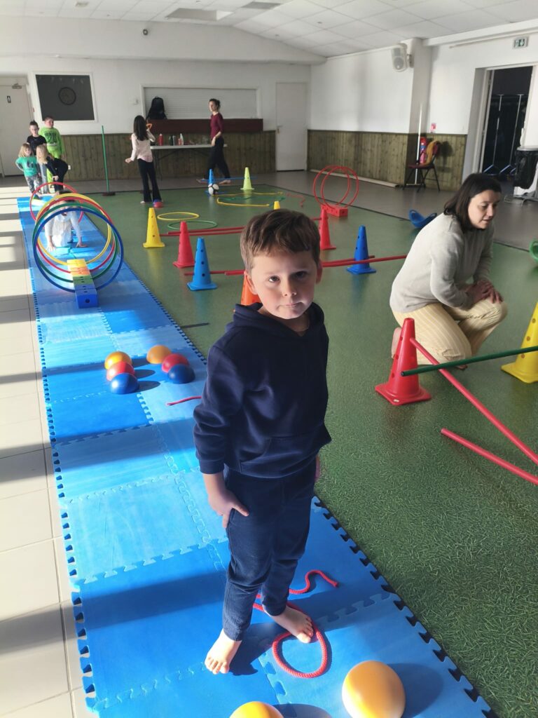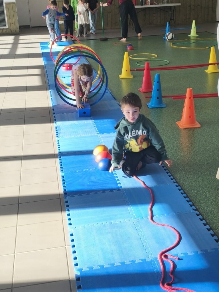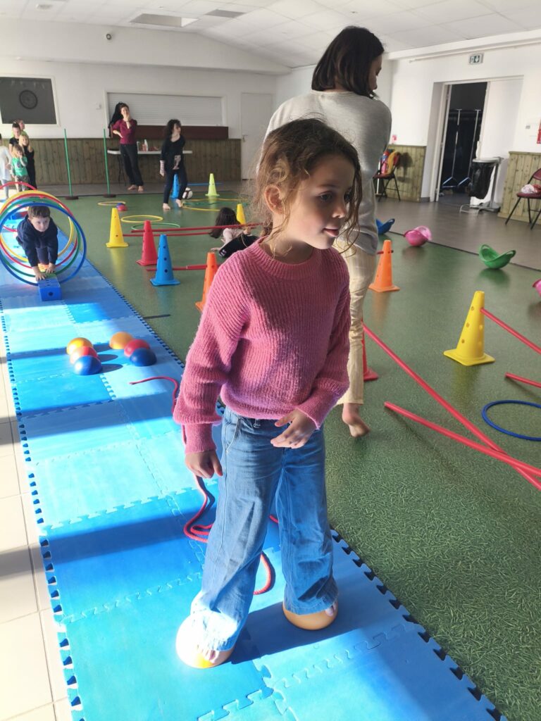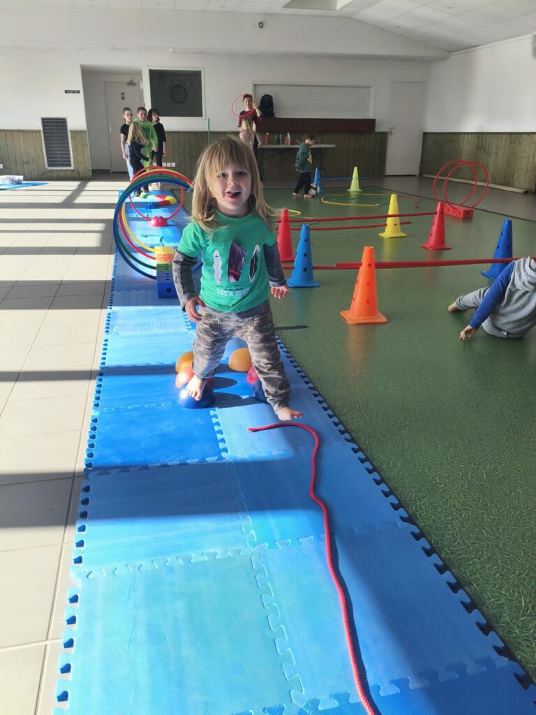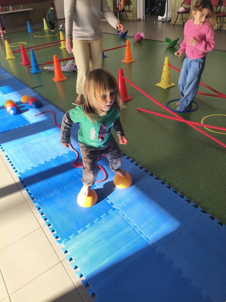 Lise et Cassandra, aidées des enfants, avaient préparé un parcours de motricité géant dans la salle des fêtes. Les enfants ont pu découvrir plein de nouvelles activités motrices, comme par exemple le “rolla bolla”, planche posée sur un rouleau, sur laquelle on doit tenir en équilibre.