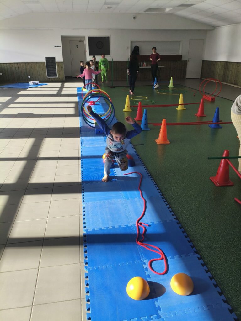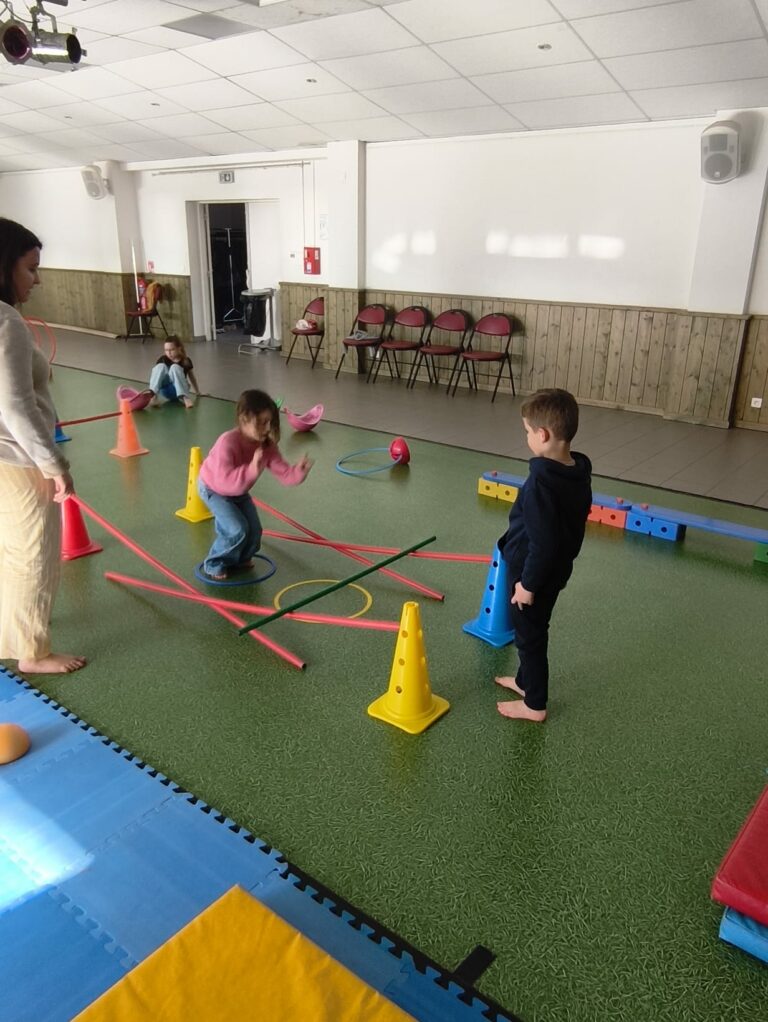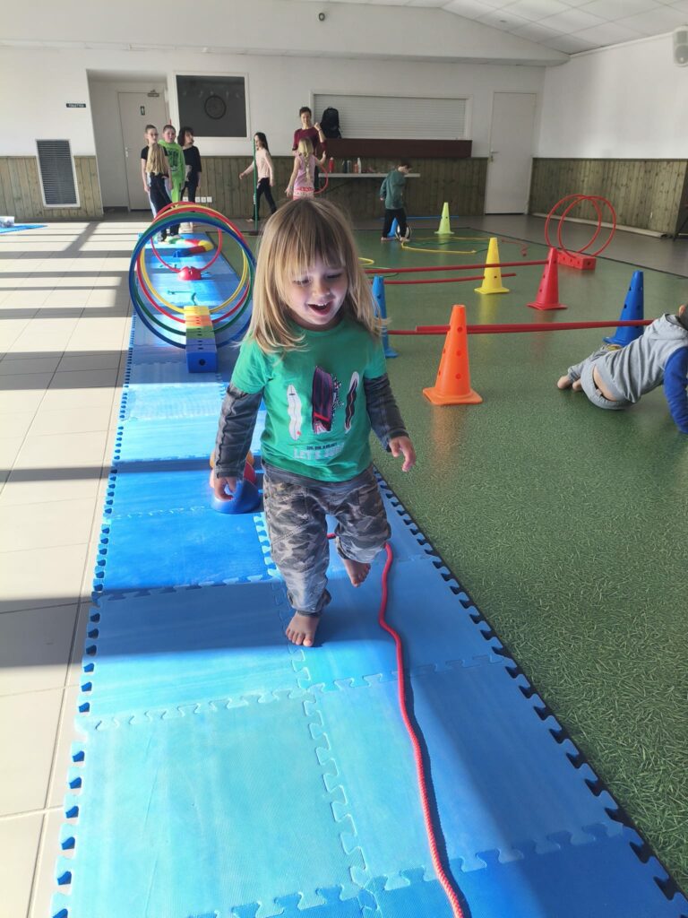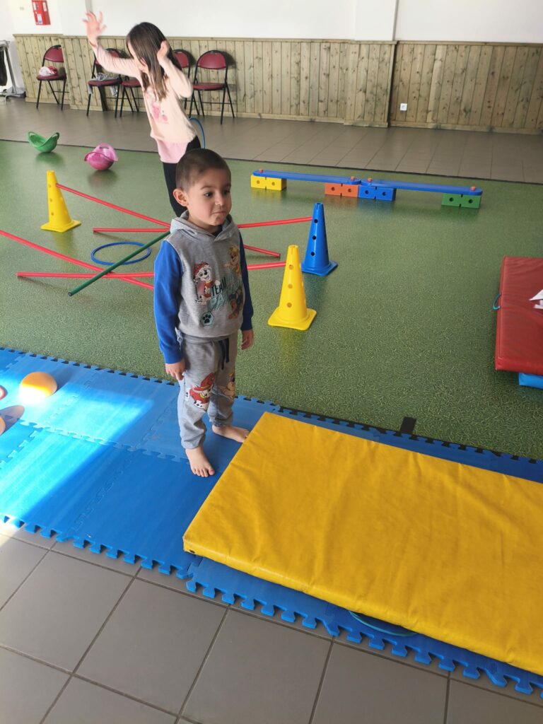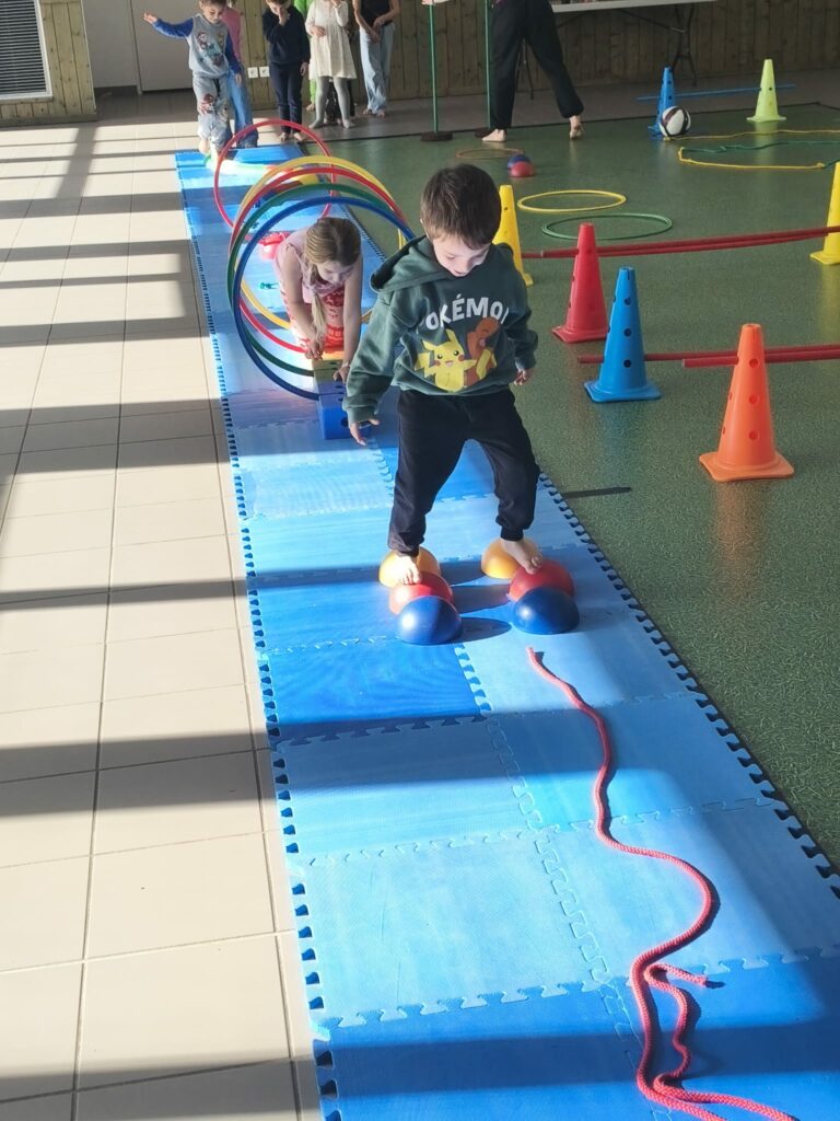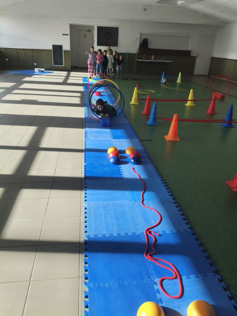 Lise et Cassandra, aidées des enfants, avaient préparé un parcours de motricité géant dans la salle des fêtes. Les enfants ont pu découvrir plein de nouvelles activités motrices, comme par exemple le “rolla bolla”, planche posée sur un rouleau, sur laquelle on doit tenir en équilibre.